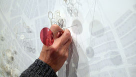 Visitors pinning their responses on the interactive map of the city of Umea, Sweden. Image from the exhibition at Bildmuseet in Umeå, Sweden